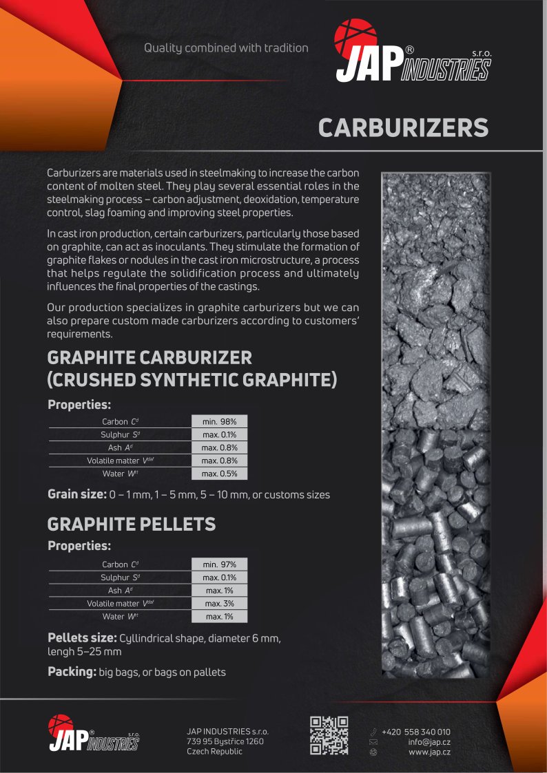 U grafitových pelet zaručujeme obsah uhlíku min. 97 % při obsahu síry max. 0,1 %, obsahu popela max. 0,8 % a obsahu prchavých látek max. 1 %. Pelety mají tvar válečků o průměru 6 mm s proměnlivou délkou 5–25 mm.