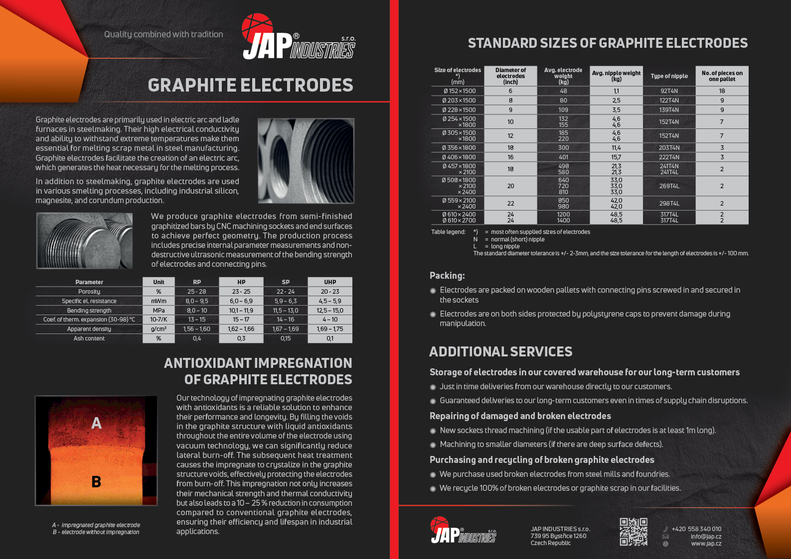 Nabízíme grafitové elektrody v jakostech HP, SHP a UHP v průměrech 152 – 610 mm.