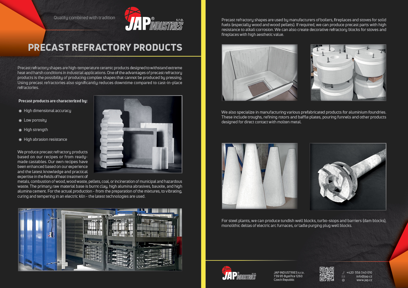 Výrobu žárobetonových prefabrikátů jsme zahájili v roce 2022. Náš pracovní tým má však již dlouholeté zkušenosti v tomto oboru. Tvarovky vyrábíme na základě vlastních receptur nebo z hotových směsí. Vlastní receptury jsou zdokonalovány na základě historických zkušeností a nejnovějších poznatků a praktických zkušeností v oblastech tepelného zpracování kovů, spalování dřeva, dřevního odpadu, peletek, uhlí, či spalování komunálního i nebezpečného odpadu. Základní surovinovou bází jsou pálené lupky, vysocehlinitá ostřiva, bauxit a vysocehlinité cementy. Pro vlastní výrobu – od přípravy směsí, přes vibrování, zrání, až po temperování v elektrické vypalovací peci – jsou použity nejmodernější technologie.